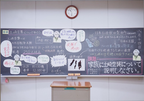 高校生を中心とした若い世代に、戦争を起こしてはいけないということを伝えるために制作しました。ターゲットの目に留まるように、若い世代に馴染みのある黒板をモチーフに、土崎空襲の語り部をされている伊藤津紀子さんの「平和の授業」という設定にしました。キャッチコピーは、若い世代が土崎空襲を知り、語り継いでほしいという思いを込めました。